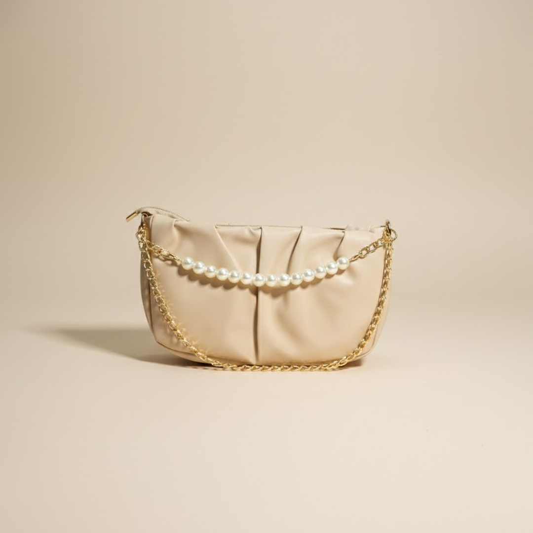 Add a touch of sophistication to your evening look with this chic beige handbag. Designed with a luxe gold chain and a statement pearl detail, this bag perfectly balances modern style with timeless elegance.