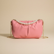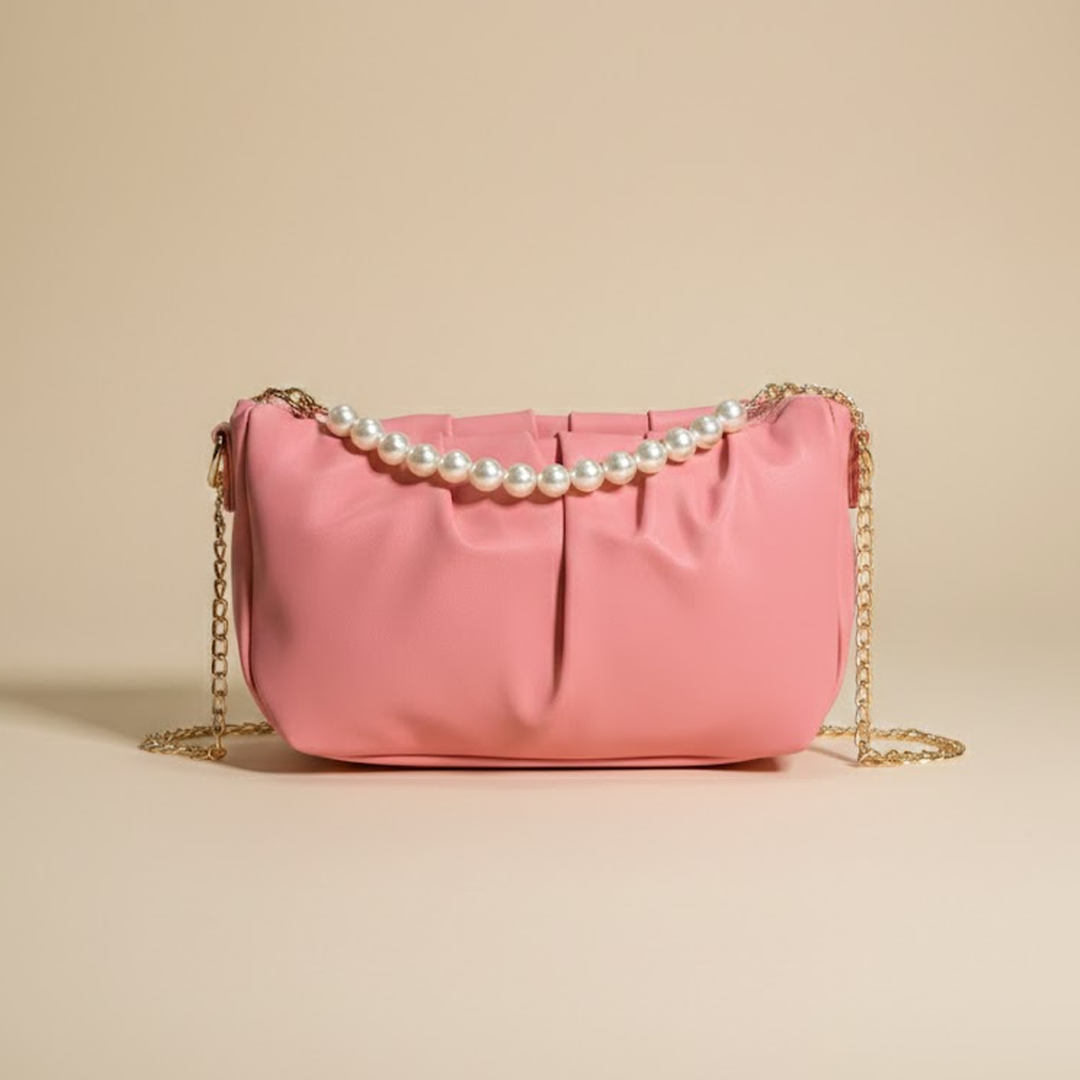This adorable pink clutch combines the softness of pastel hues with the elegance of pearls. Adorned with a beautiful pearl chain and gold detailing, it’s the perfect accessory to elevate any evening or special occasion look.