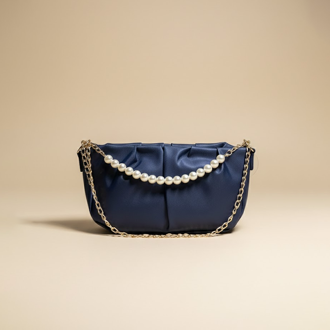 Make a statement with this luxurious navy blue clutch, complete with a beautiful pearl chain for an added touch of sophistication. Perfect for evening events or special occasions, this clutch effortlessly combines elegance and modern chic, making it a must-have accessory.