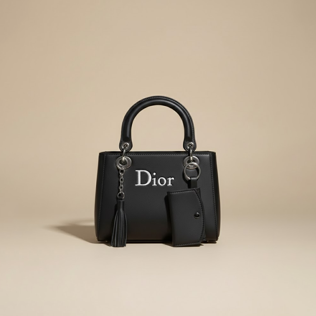 Embrace sophistication with the Dior black handbag, crafted for the modern woman who values style and luxury. The iconic Dior logo embossed on the front adds a touch of class, while the functional tassels and a convenient wallet attachment make it both practical and fashionable. Whether it's a day at the office or an evening out, this versatile bag will elevate your look.